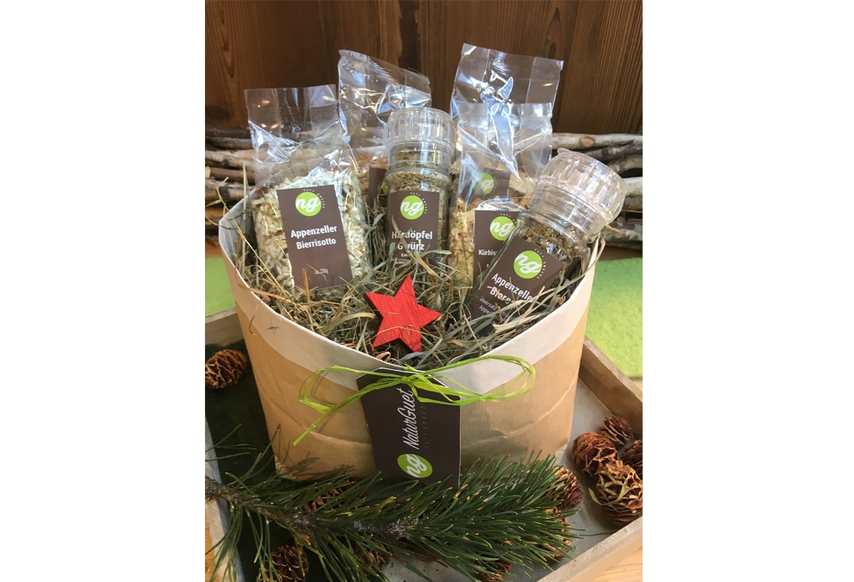 Verschiedene Appenzeller Produkte wie das Appenzeller Bierrisotto oder der tradizionellen Chämisuppe. Verpackt in einem biologisch abbaubaren Geschenksack mit Naturheu gefüllt. Ideales Kunden- oder Mitarbeitergeschenk. Gerne können wir nach Wunsch diese Geschenke an eine Region oder Stadt in der Schweiz anpassen, genau diese die zu Ihrem Unternehmen passt.