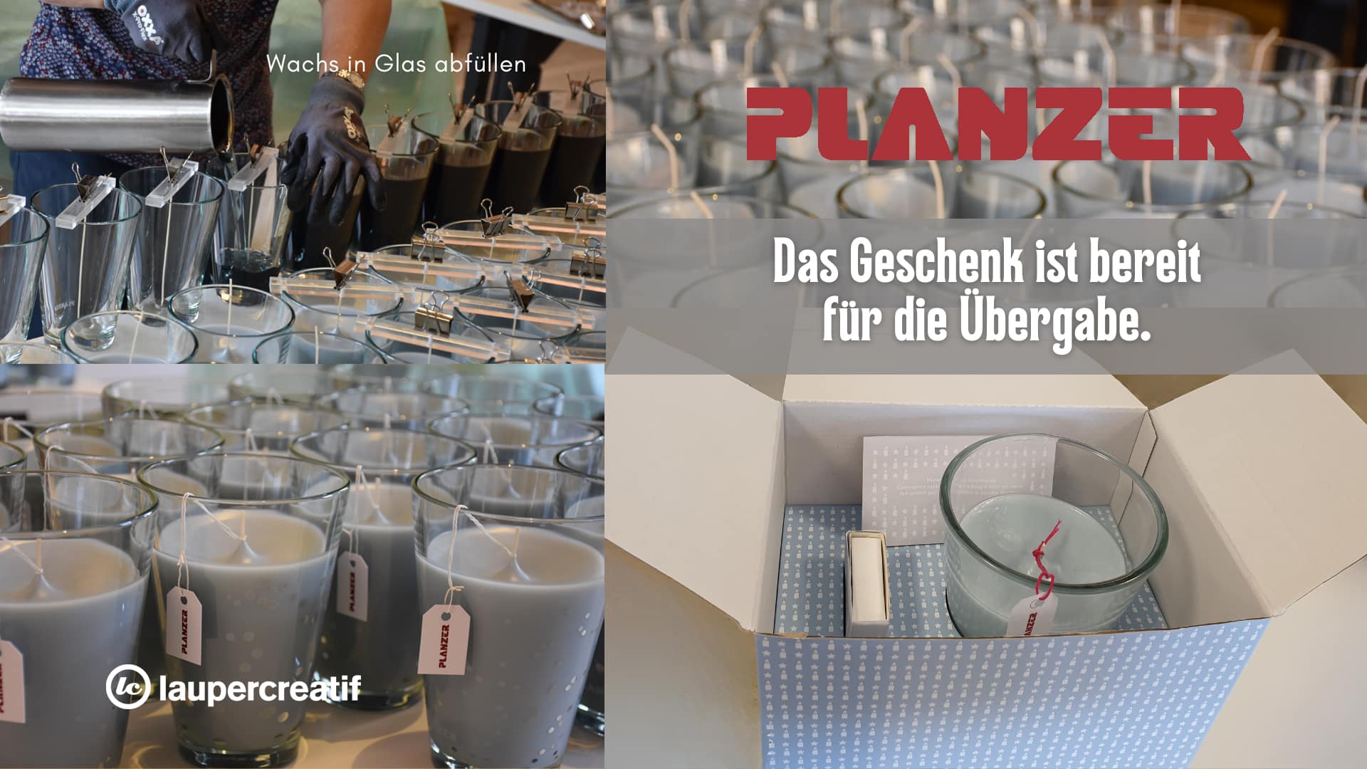 Für das Familienunternehmen Planzer wurde ein hochwertiges Geschenk zu Weihnachten gesucht. Umgesetz wurde eine sehr hochwertie Kerze im Glas, dieses wurde in der Stadt Zürich hergetsellt. Auf dem Kerzenglas wurden dei Logos sehr dezent gelasert.
